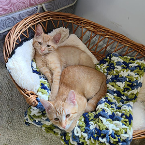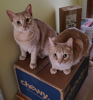 The Ginger Boys get a daily multivitamin with Omega 3s in it for coat health. This is their “jackpot” treat. No matter where they are in the house, if you call out “Vitamins,” they will come running. In addition to reducing the shedding of dander particles, this keeps their coat soft and glossy.